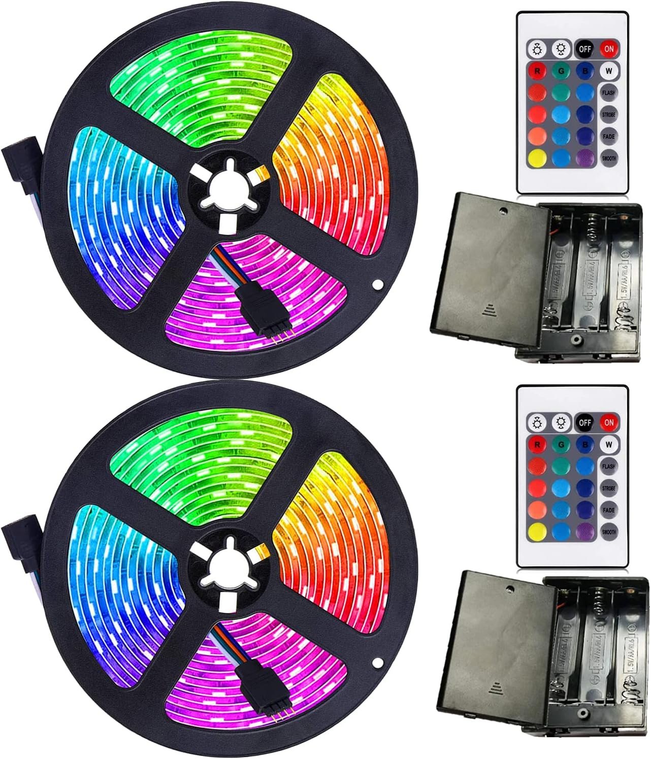 LED Light Strip 2x2M(2×6.6 Feet) 60LEDs These battery powered led lights are fantastic! they are battery-operated, the battery LED strip lighting can go literally anywhere. settings that you to change between colors and have them remain solid or flash. The RGB LED lights strips will be awesome for parties, holiday decor, or everyday ambiance, and the led battery lights are very user-friendly. Feature: ●Environmental friendly; without harmful substances or radiation; Safe for children ●After cutting the strip lights, the part that does not connect to the power supply will not be used ●24-Keys Remote Controlled 1) Brightness “+” or “-”, When lighting 16 single colour, you can adjust the brightness of the light through the remote control 2) FLASH: 7 colour jumpy change 3) STROBE: white fade in or out 4) FADE: 7 colour fade change 5) SMOOTH: 7 base colour jumpy 6) When you select the above 2, 3, 4, 5 mode, the adjustment button will change from adjusting the brightness to adjusting the speed. Tips: ●[Important] If the light stuck on one colour or flashes, but it can’t be controlled remotely, because of the battery has no electricity. Please replace 3 new batteries immediately. If the remote control still doesn’t work after the strip light replacing the batteries, you can directly disconnect the connecting line of the battery box and the strip light, do not turn off power when disconnecting, then press “RED” key on the remote, and re-connect the wire, remote can be working. ●When the product is not used, please close the remote control and battery box switch, or directly close the battery box switch to save battery power Package Include: ● 2 x Led Strip Light – 2m/6.56ft ●2 x Battery Box ● 2x Remote Control