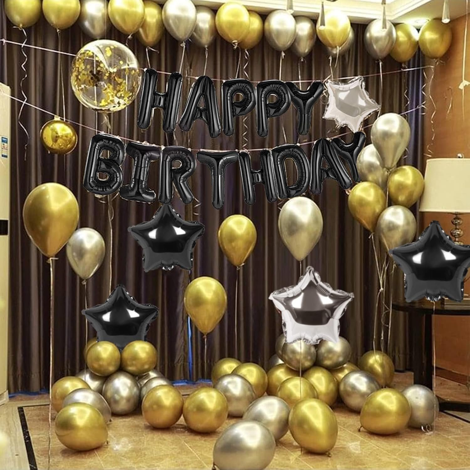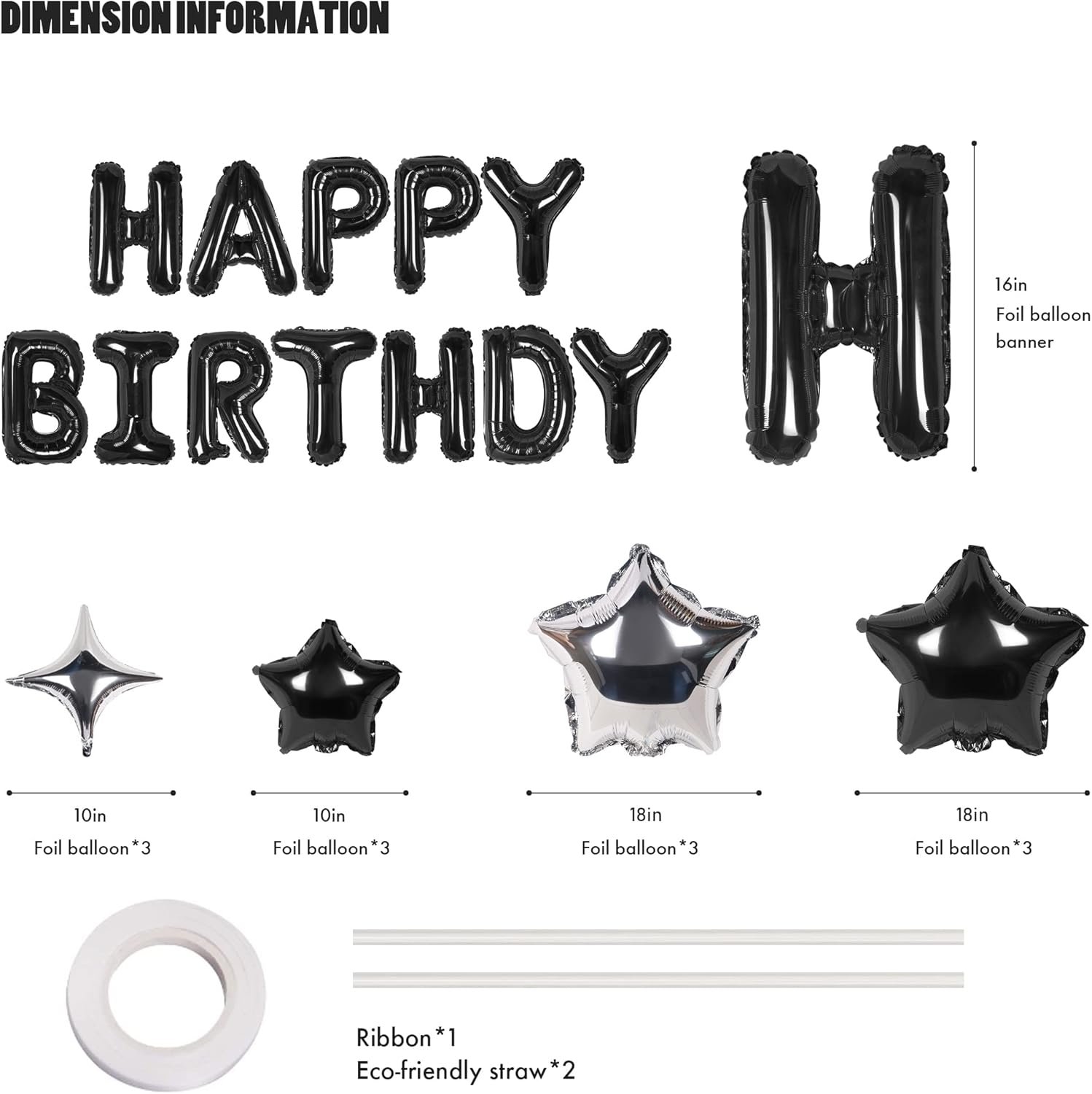 VALUE PACKAGE: Per package ①Black Birthday letters x13pcs (16″) ② Black four-corner star x3pcs (10 inch)③ Black five-pointed star x3pcs (25.4cm) ④ Black five-pointed star x3pcs + Silver five-pointed star x3pcs (18 inch) ⑤Plastic straw x2pcs Ribbon x 1 piece.