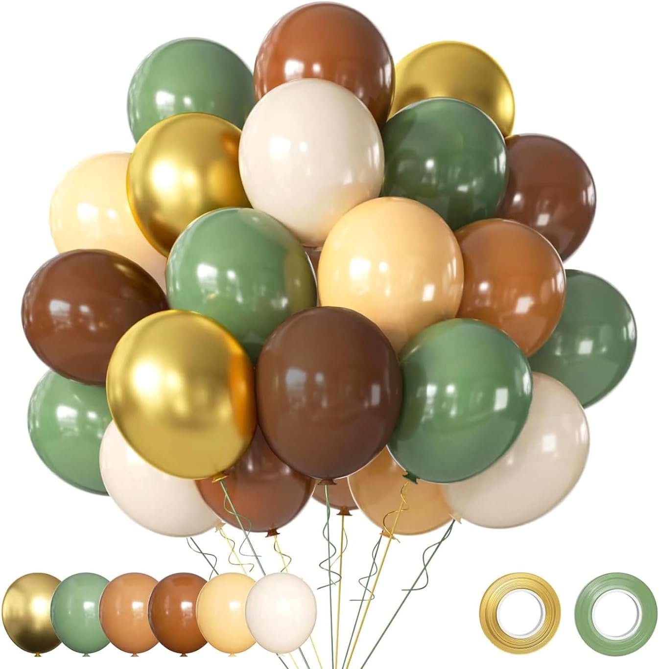 【All-in-One Kit】: This green brown gold balloon kit includes everything you need to create a stunning decoration, metallic chrome gold balloons 10pcs, sage olive green retro green balloons 15pcs, cream balloons 10pcs, blush nude balloons 10pcs, brown balloons 10pcs, coffee cocoa balloons 5pcs, 2pcs green balloon ribbons 32ft. The size of the balloon is about 12 inches after inflation. the synergy of green brown cream gold balloon jungle balloons can make any party or occasion more elegant.