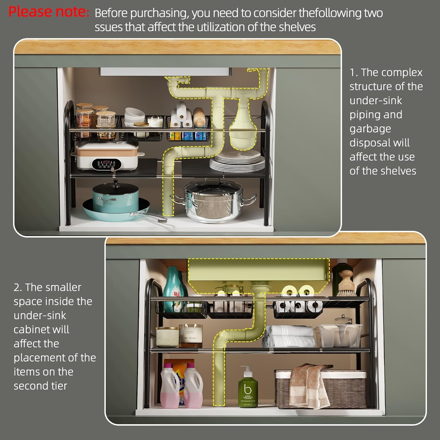 【Instructions for use】: If placed inside the cabinet under the sink, you need to know the size of the product and the adjustable height of the partition, and then actually measure the height of the space inside the cabinet, if the height is too low, the height of the items placed on the top will be limited! Differences in the shape and height of the under sink pipes can also have an impact on the height of items placed! You can measure and then choose the right size!