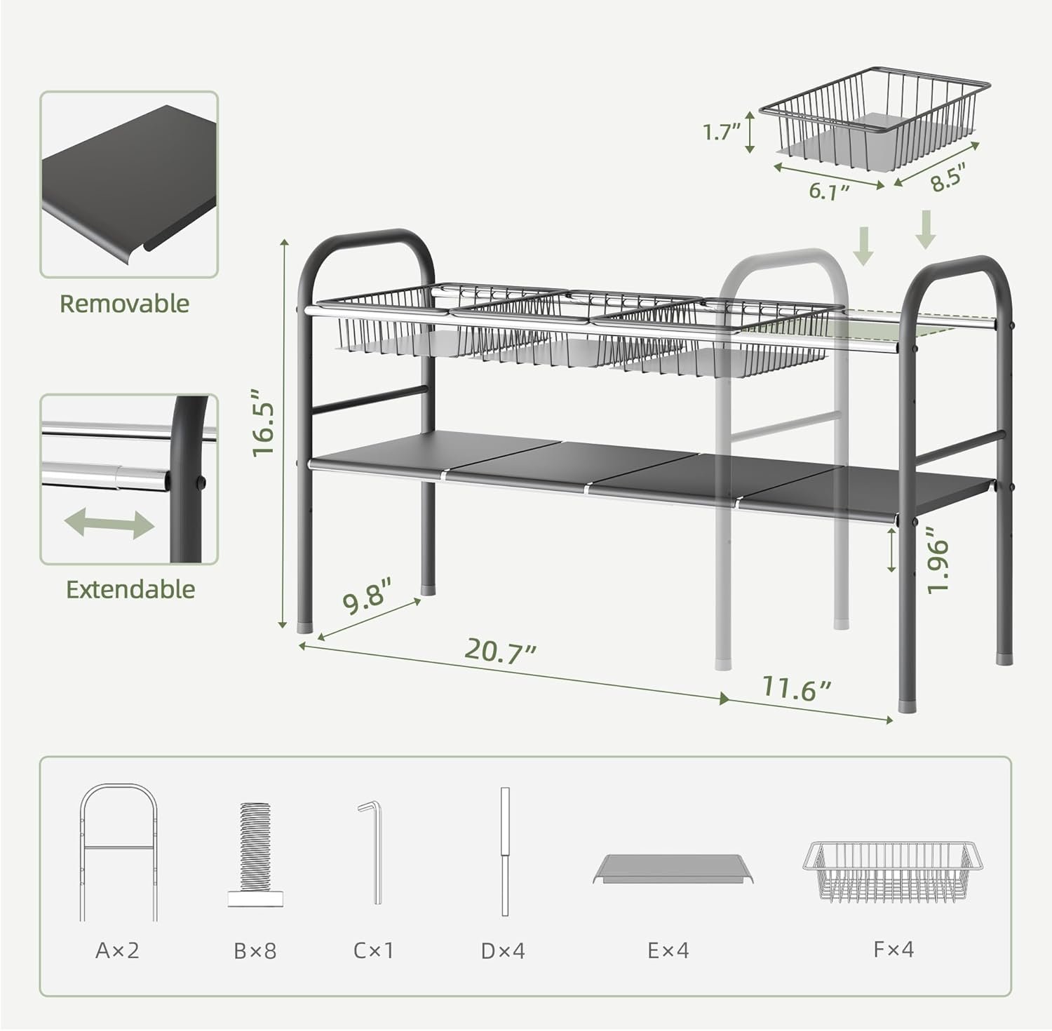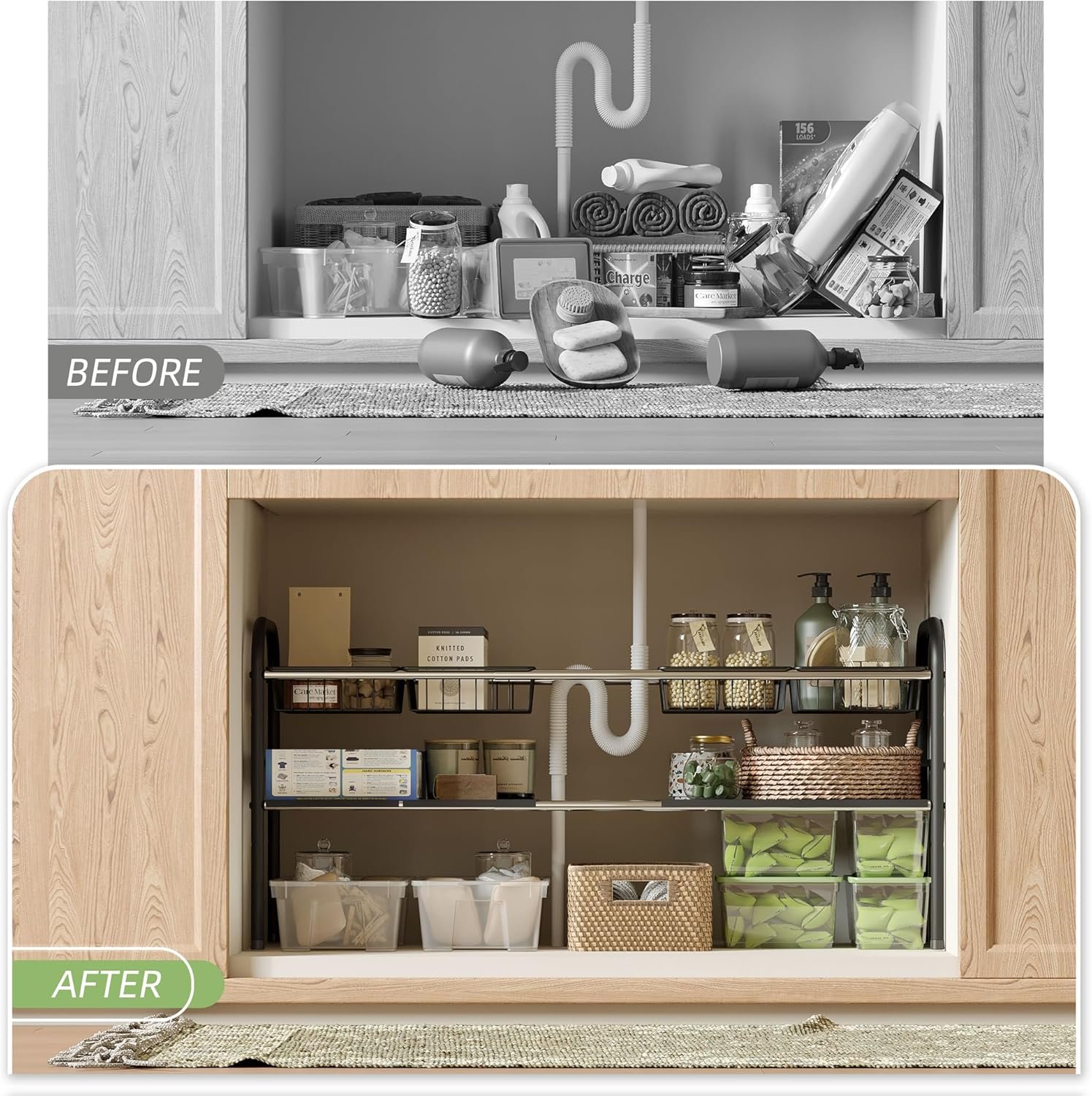 【Purchase Note】: The minimum size of the adjustable under kitchen sink organizer is 20.7 x 9.8 x 16.5 inches; the maximum size is 32.3 x 9.8 x 16.5 inches. Package Included: 4 baskets and 4 panels.