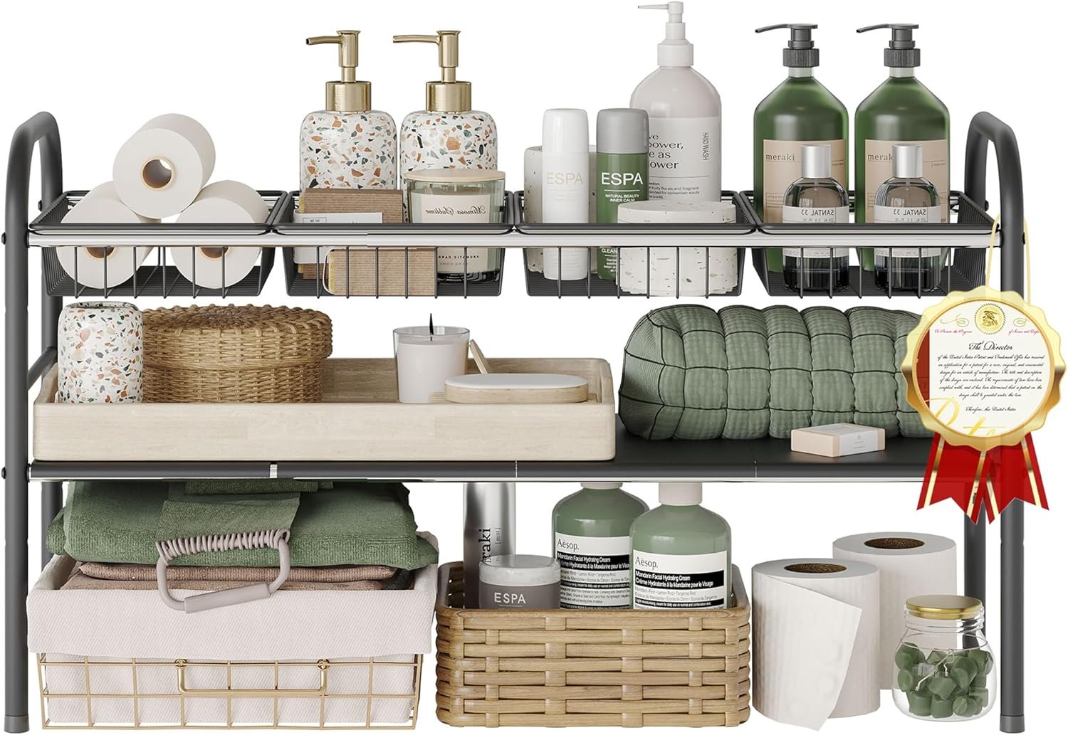 NETEL Under Sink Organizers and Storage, 2 Tier Expandable Under Cabinet Organizer Shelf with 4 Baskets and 4 Panels, Expandable Shelf for Cupboard, Kitchen, Bathroom, Shoe Storage Rack
